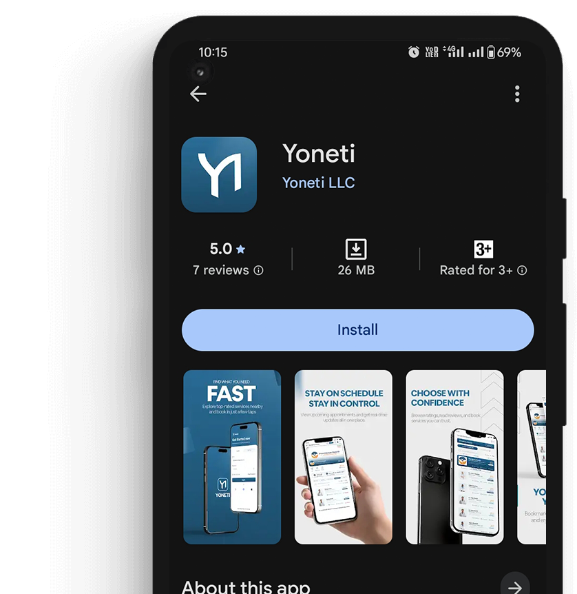 Simply download the Yoneti app, create an account, explore nearby professionals or services, and book the time that works best for you. You can reschedule, swap, or track appointments directly through the app.